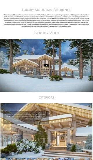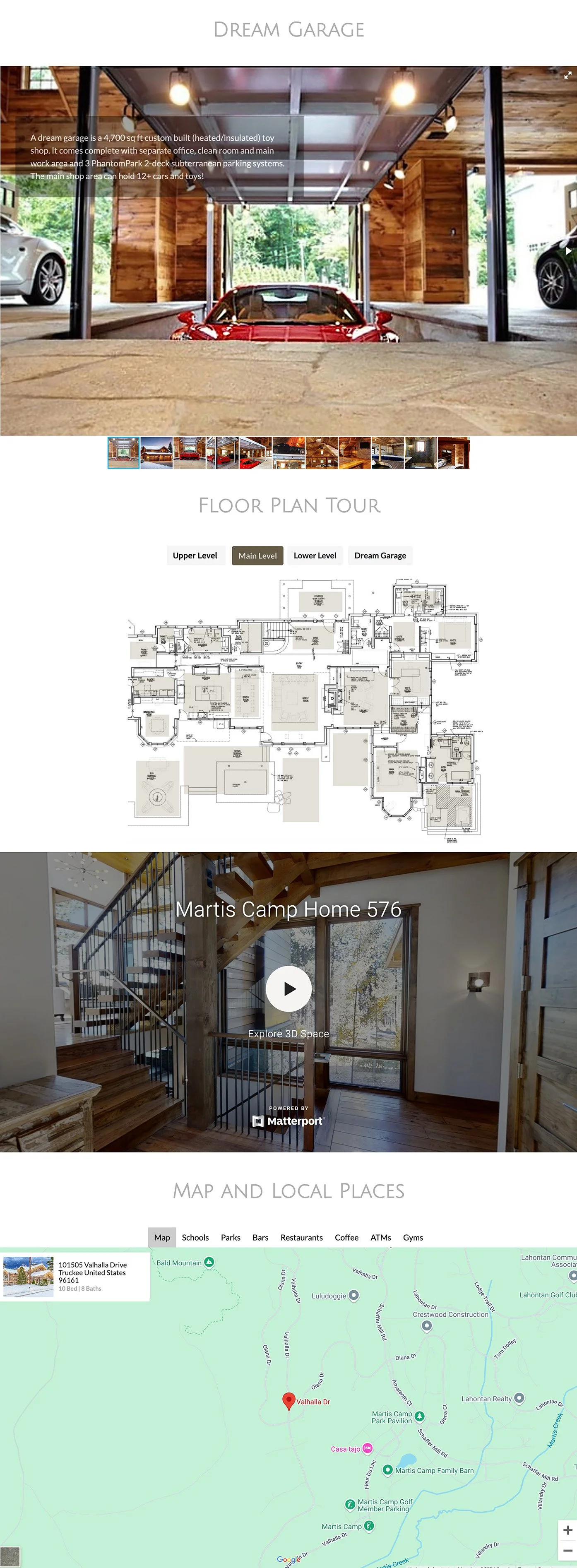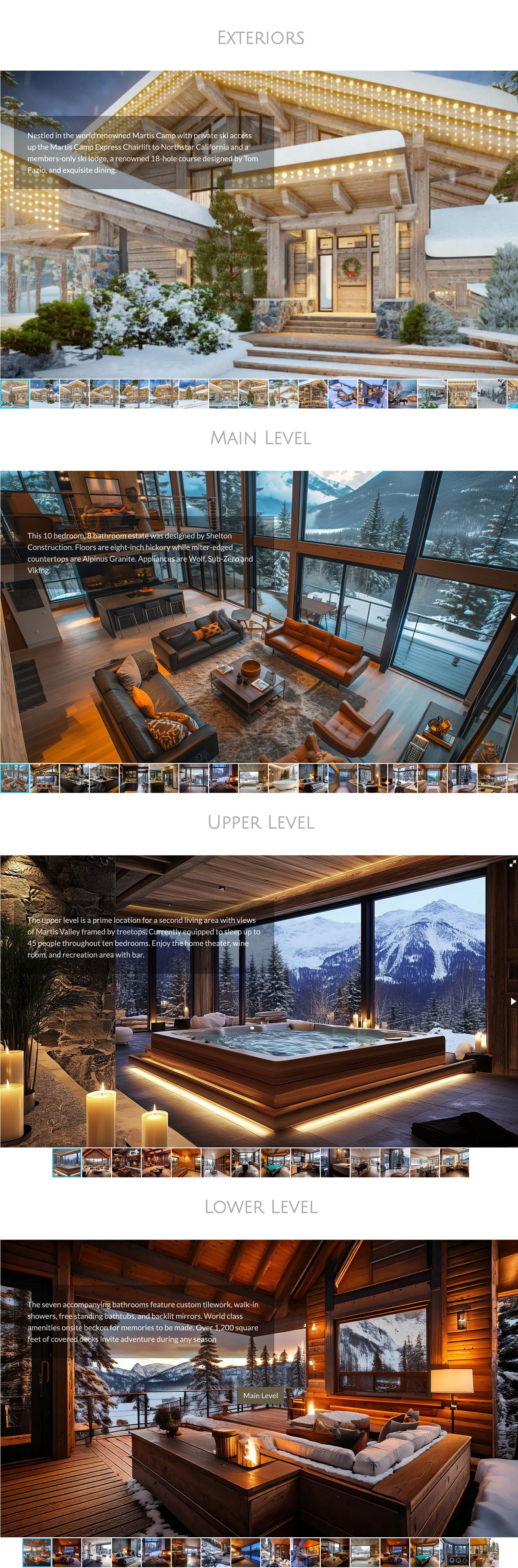 Proprietary story-driven photo gallery system (titled sections like Main Level, Upper Level, Exteriors, etc.)